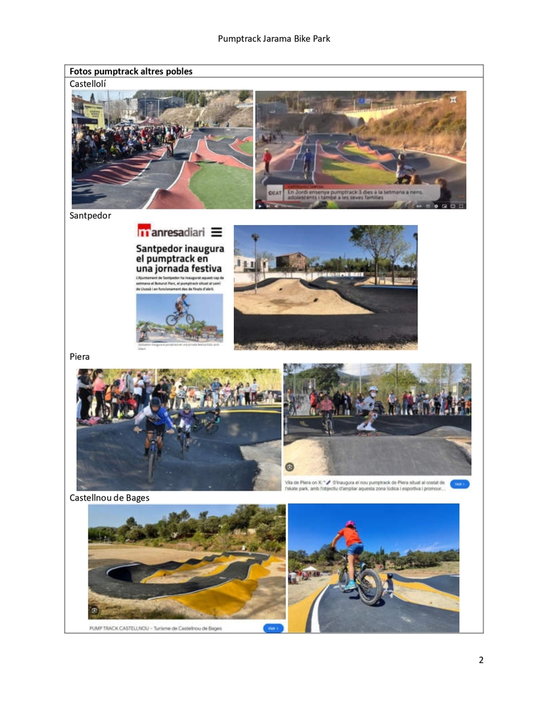 S'adjunten fotografies d'exemples d’altres municipis, com ara Castellolí, Santpedor, Piera i Castellnou de Bages, on s’han construït pumptracks similars.
